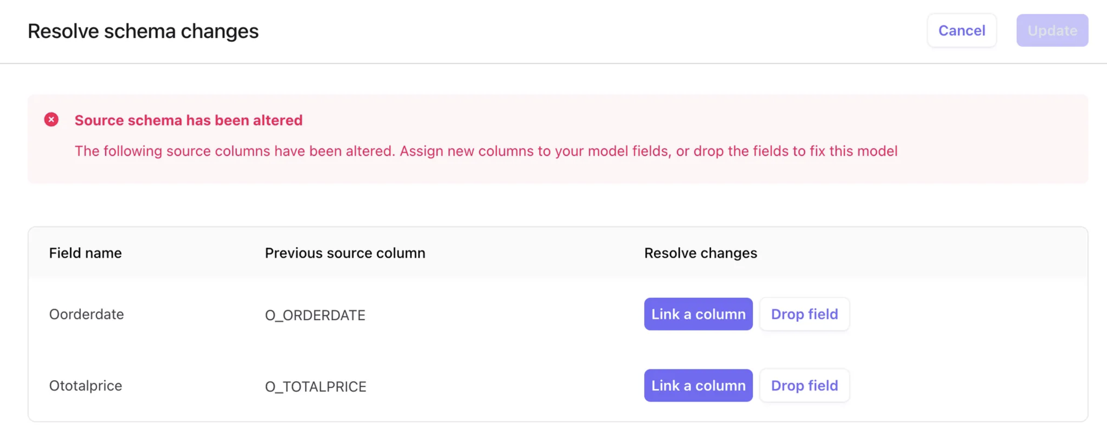 * **Schema Validation Issues**: These alerts occur when the model schema has been modified. This is particularly the case when a column in the source has changed type or been deleted, while it was used in a segment.\