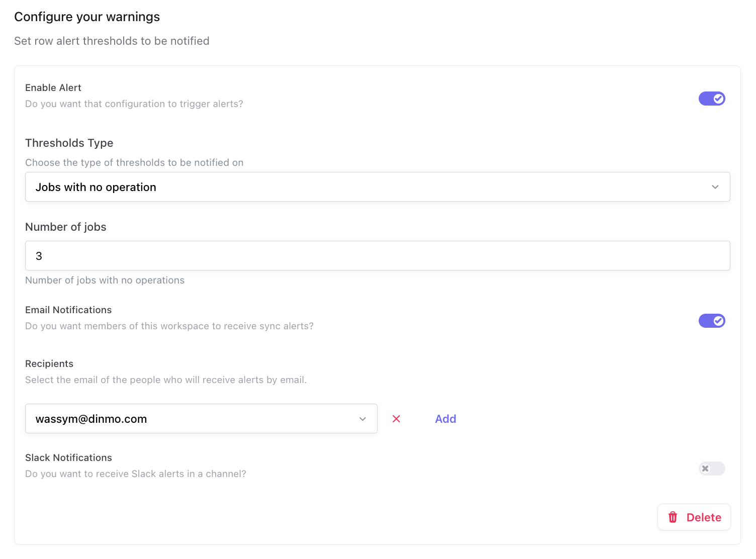 You can set warnings and alerts to monitor sync successes and failures. DinMo supports sending alerts via Slack and email. Warnings can be set as default for all syncs of a specific destination or at the individual sync level.