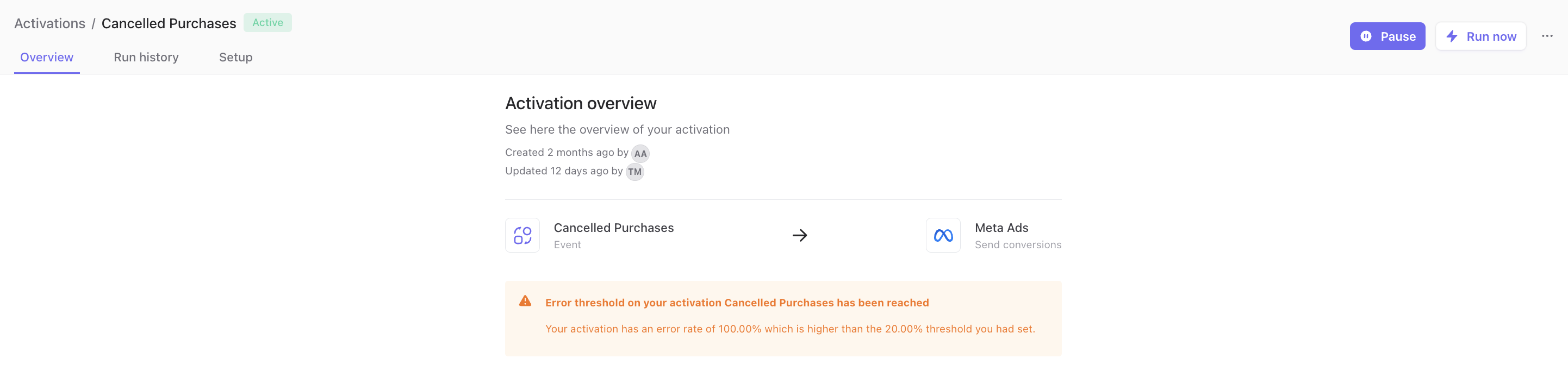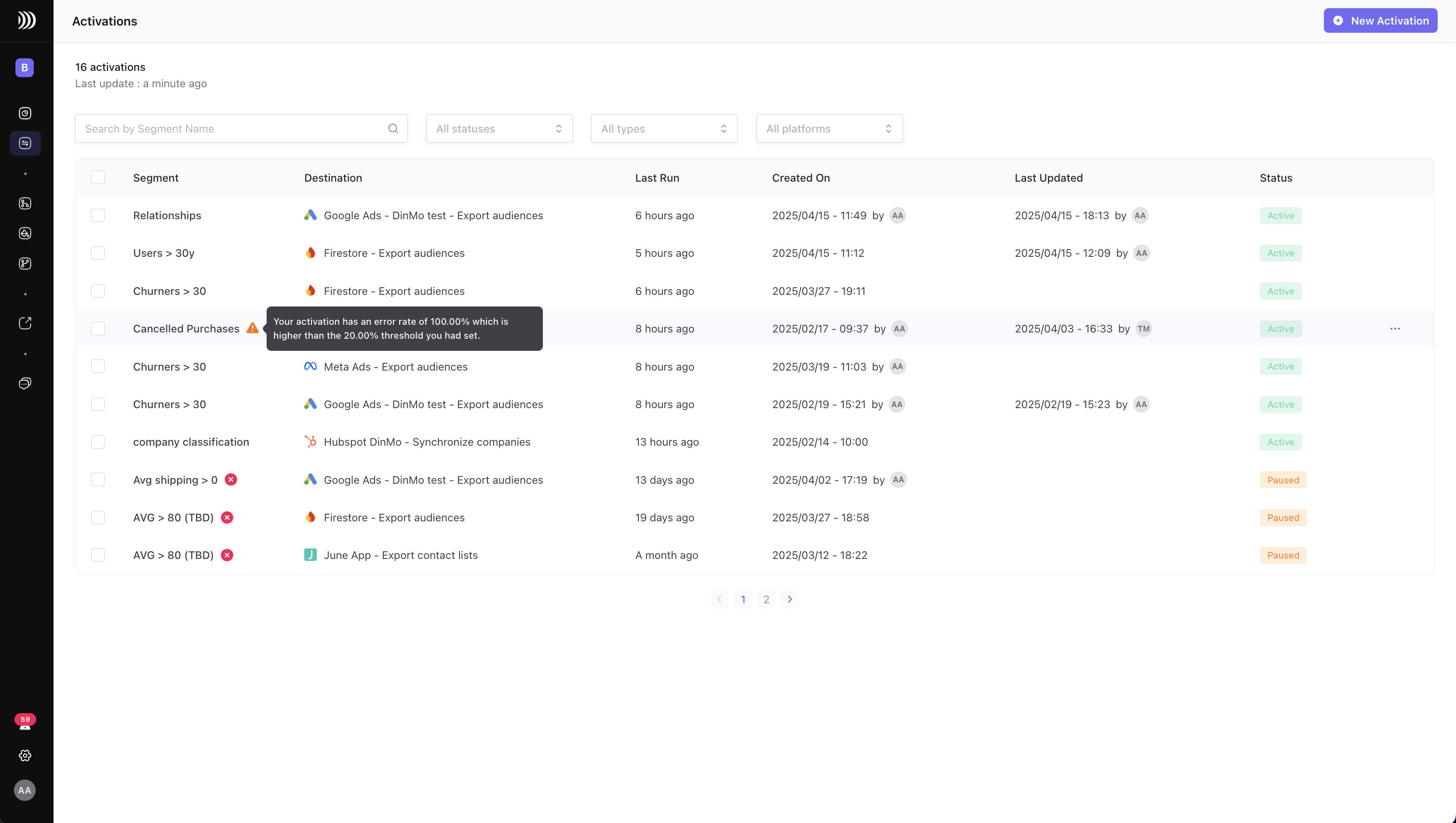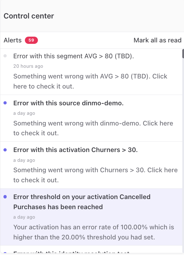 Activation failure: This alert will be triggered when an activation is not correctly sent to the destination (failed status for the entire sync). You'll get more information on the reasons for sync failure at overview level (insufficient credentials, missing source data, etc.).