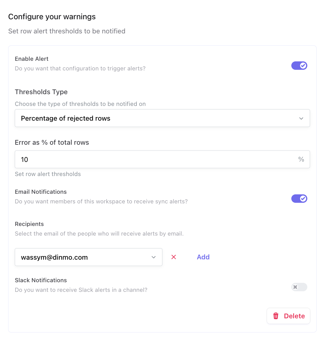 If you choose Percentage of rejected rows, then you'll also have to choose the percentage above which you want to be alerted and the means of alert communication (email/slack).