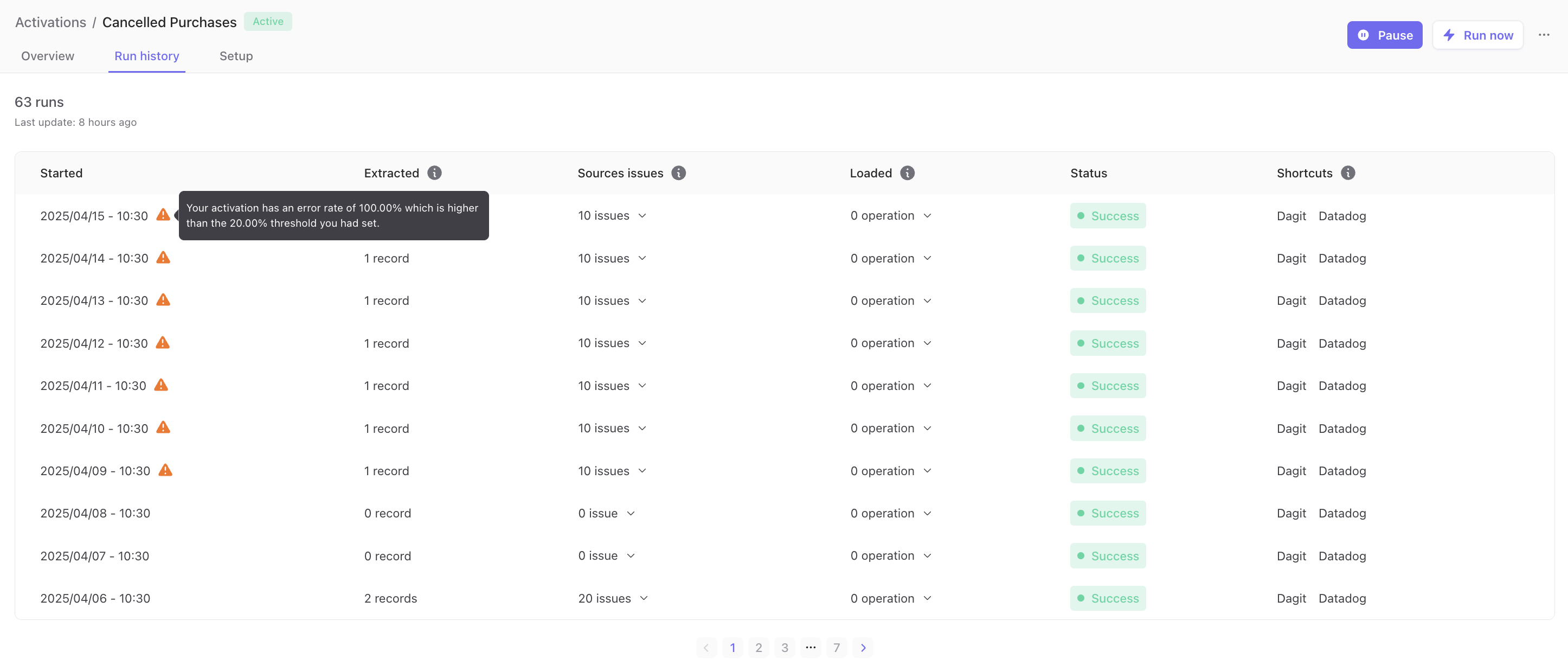 In the Activation run history