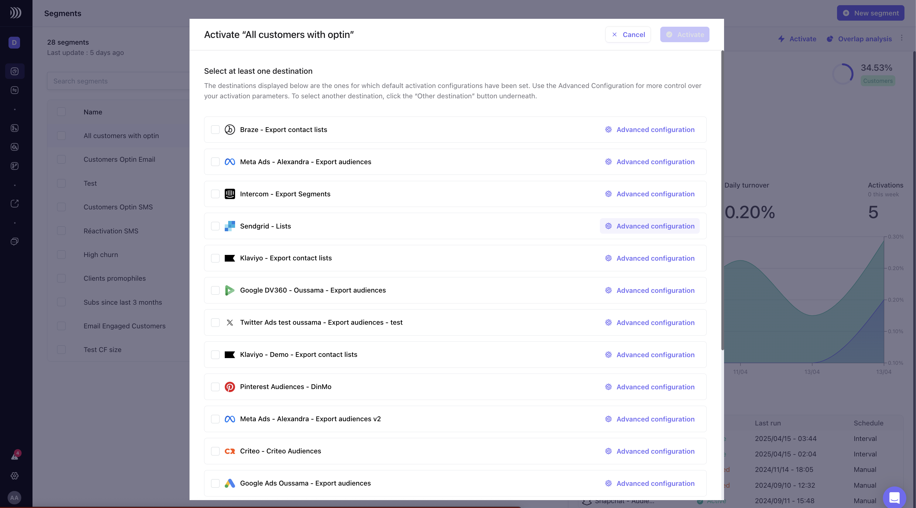 If you have created default activation settings, but do not wish to apply them to a specific activation of this destination, you can always click on “Advanced configuration”.