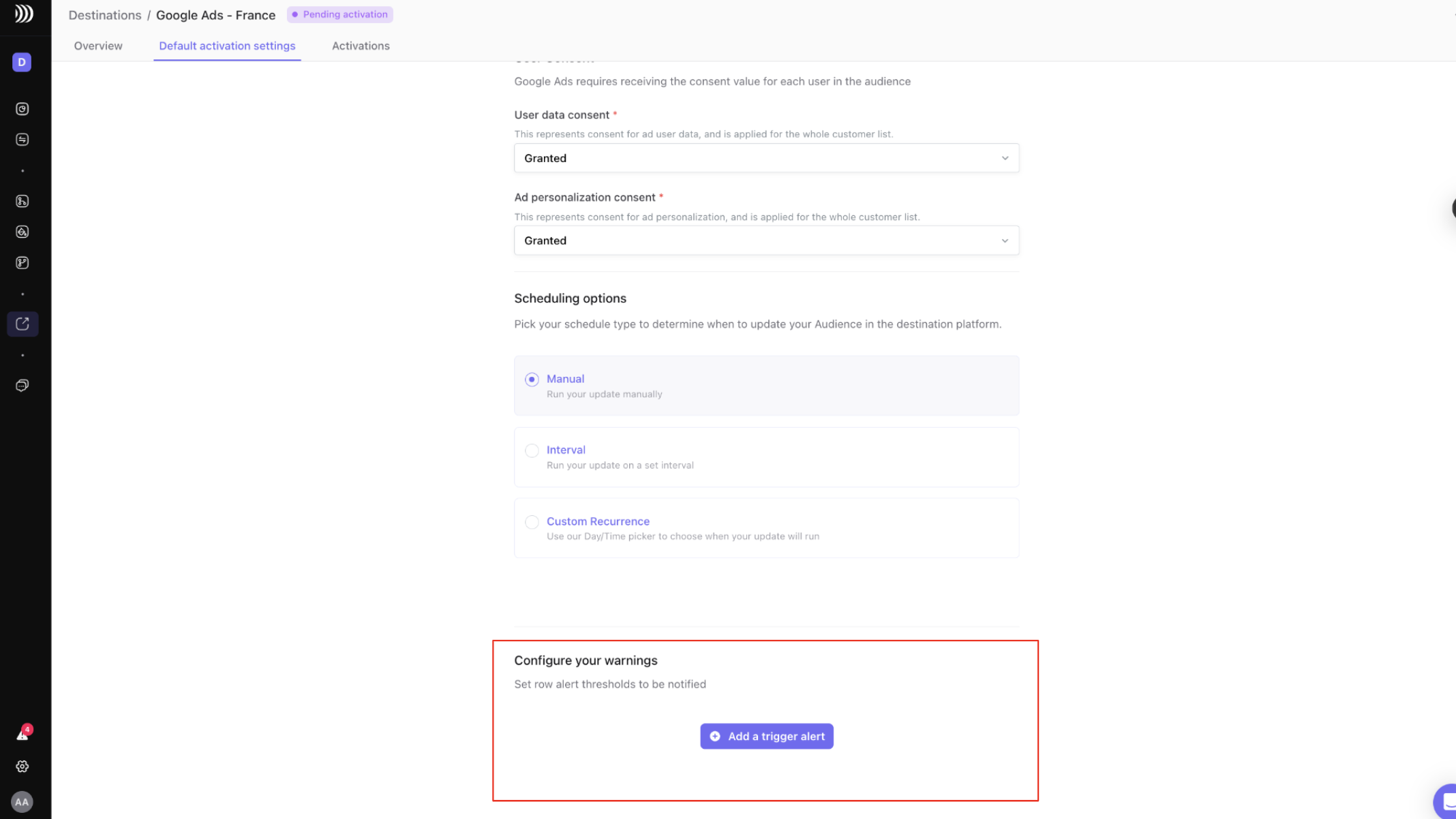 Sync-specific warnings can be configured at the destination level (and will therefore be applied by default to all activations using this destination) or at the level of a specific sync.
