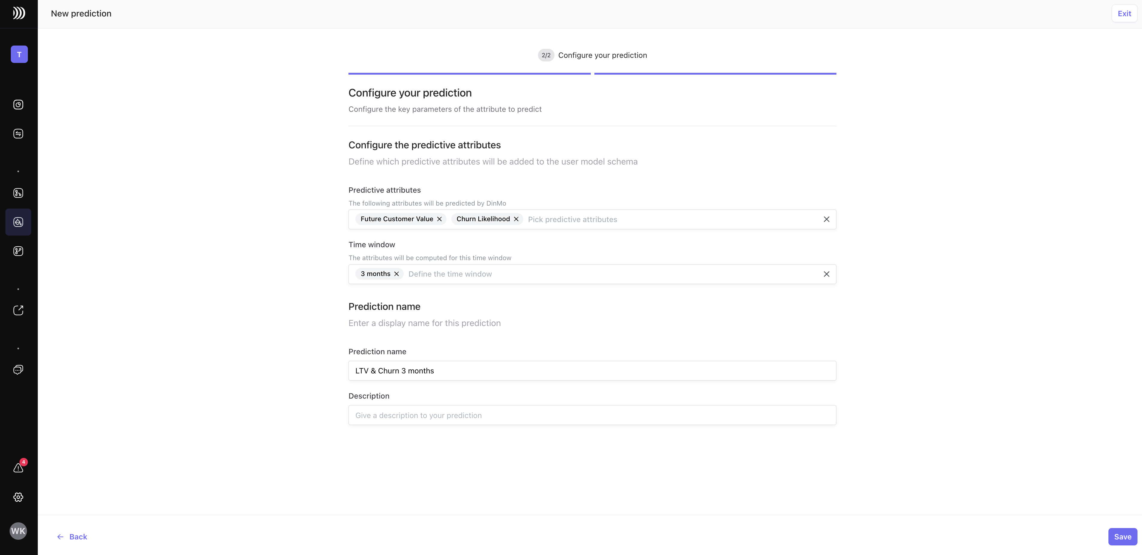 * If you select Customer Value, **choose the time window for the prediction**. For example, selecting a three-month window will compute the future customer value within the next three months.