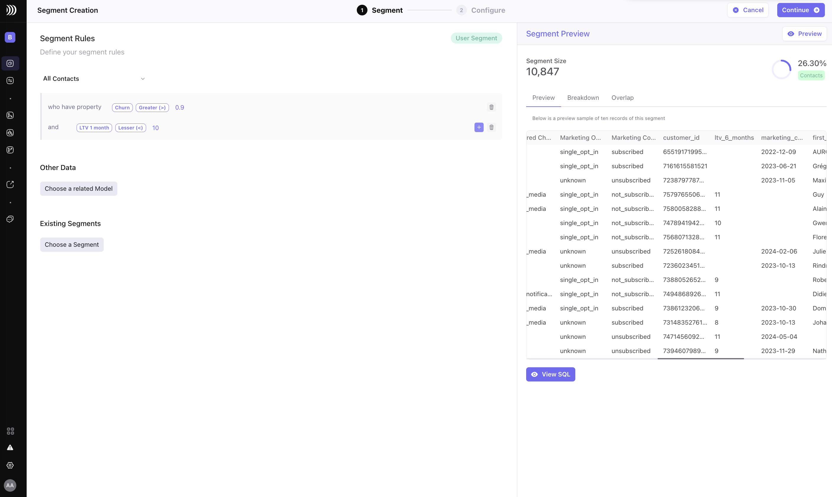 For example, you can choose customers with a churn likelihood above 90% and a LTV lesser than 10 in the coming month.