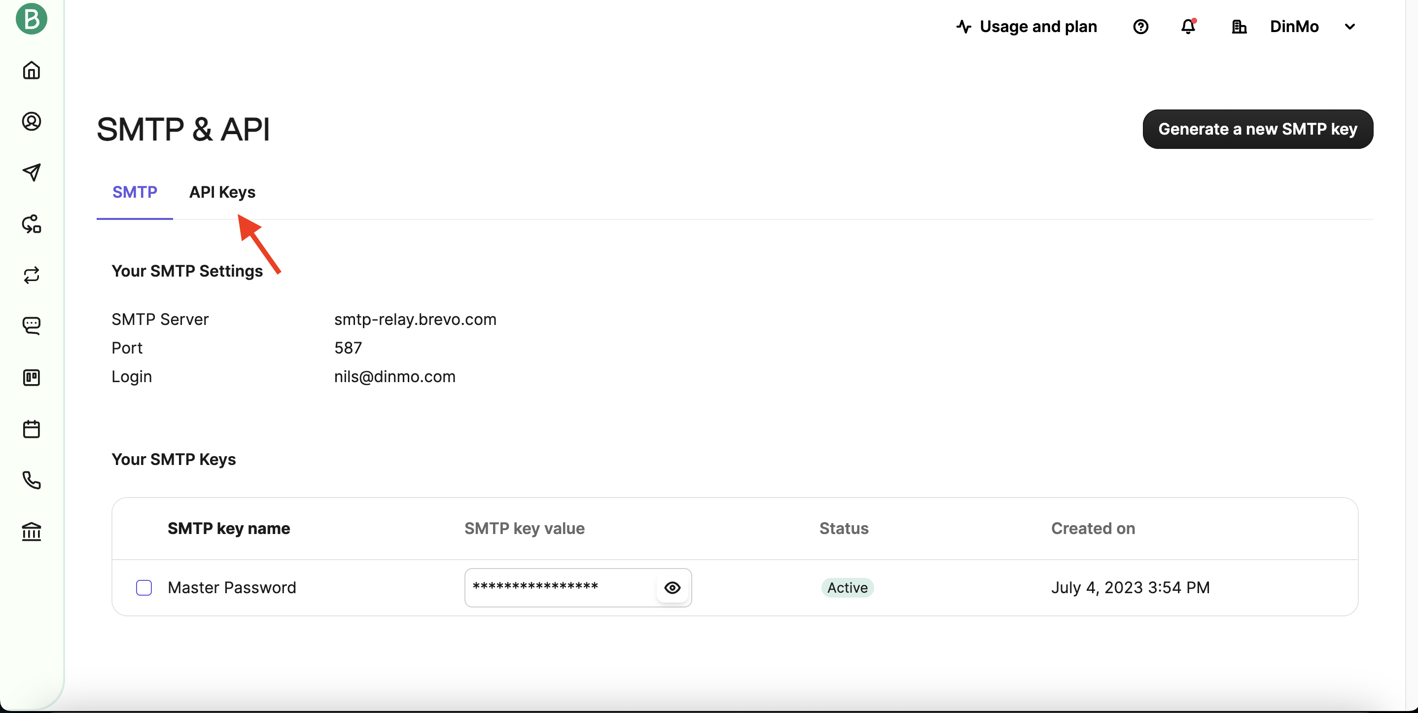And finally, generate a new API Key from there. Copy its value and paste it in the corresponding field when creating the Brevo destination in DinMo.