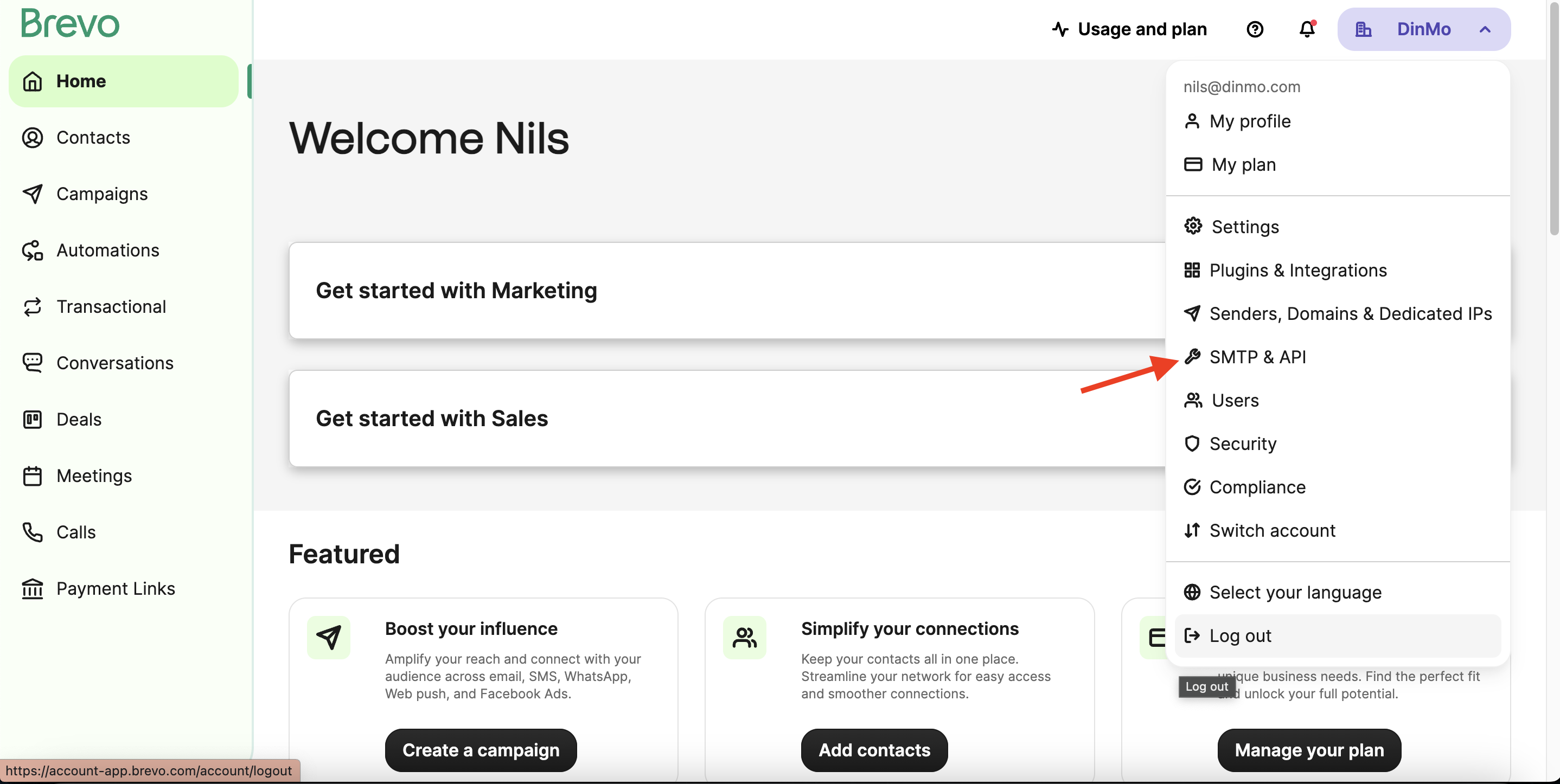**Before** generating the API key, configure your Brevo account to establish a connection with DinMo. You can do this by either: