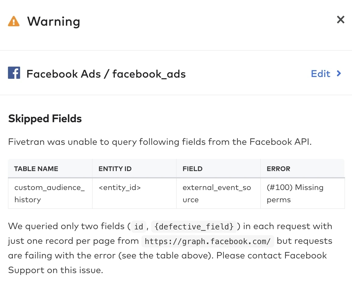 Fields that require extra permissions or contain too much data may cause a metadata sync to fail. In such cases, we skip querying those specific fields. We display the following notification about this workaround in your dashboard:
